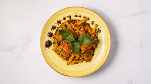 Penne pasta med broccoli, blomkål, peberfrugt, gulerødder, cherrytomater og tomatsauce.